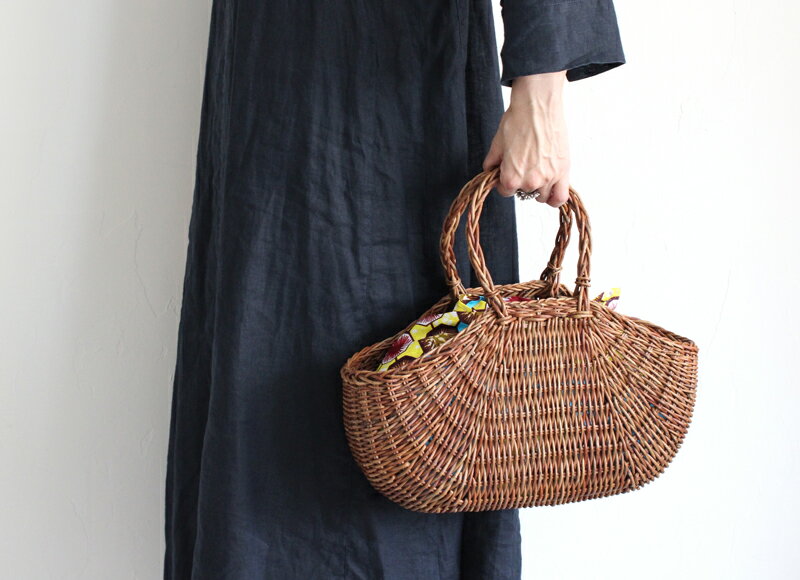 数本の蔓で編み上げられた長めの持ち手は楽に腕を通すことができます。